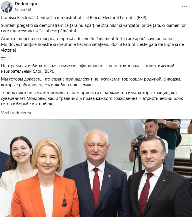 Acum, nimeni nu ne mai poate opri să aducem în Parlament forțe care apără suveranitatea Moldovei, tradițiile noastre și drepturile fiecărui cetățean. Blocul Patriotic este gata de luptă și de victorie”, se arată în mesajul scris de Igor Dodon.