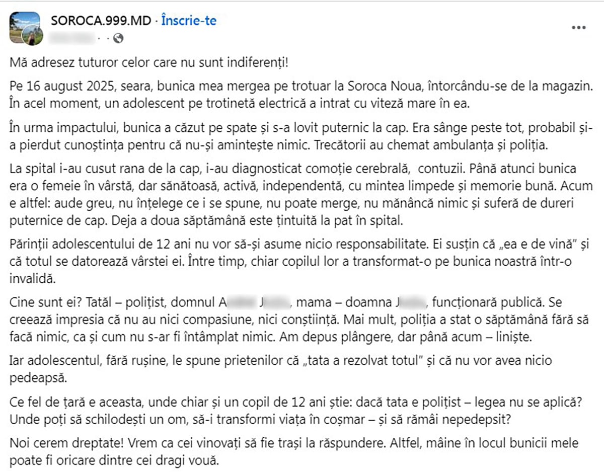 „Pe 16 august 2025, seara, bunica mea mergea pe trotuar la Soroca Nouă, întorcându-se de la magazin. În acel moment, un adolescent pe trotinetă electrică a intrat cu viteză mare în ea.