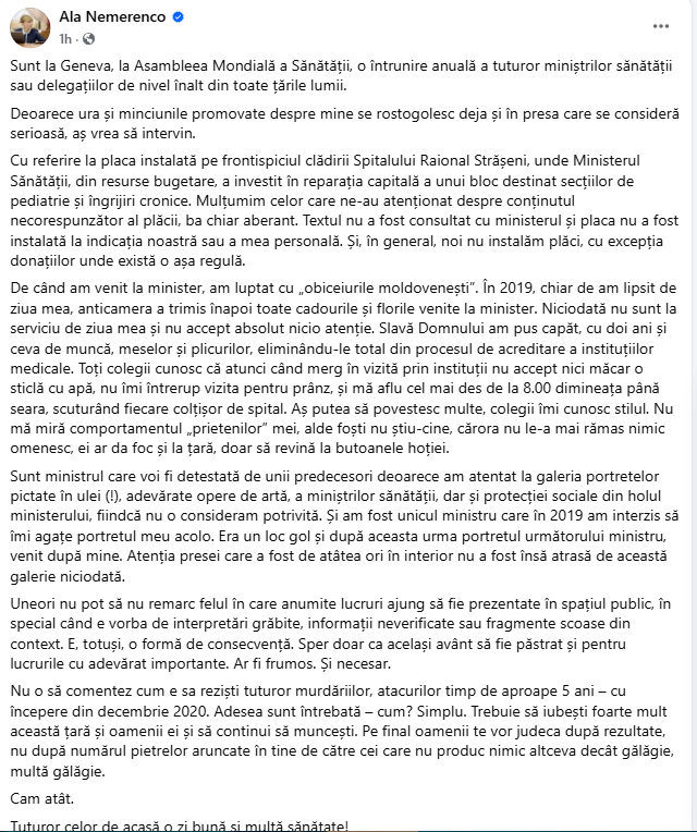 Uneori nu pot să nu remarc felul în care anumite lucruri ajung să fie prezentate în spațiul public, în special când e vorba de interpretări grăbite, informații neverificate sau fragmente scoase din context. E, totuși, o formă de consecvență. Sper doar ca același avânt să fie păstrat și pentru lucrurile cu adevărat importante. Ar fi frumos. Și necesar”, a scris Ala Nemerenco.