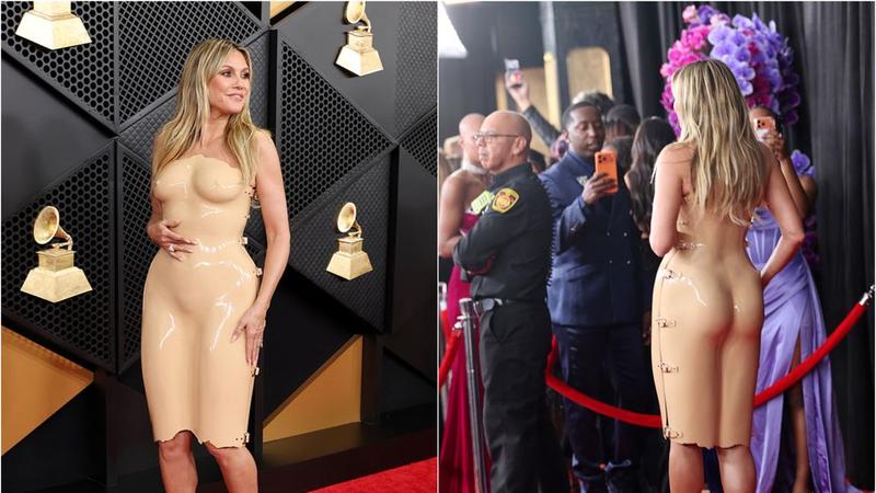 Klum a apărut la Premiile Grammy într-o rochie latex, culoarea pielii, cu umerii goi și mulată, care îi contura fiecare curbă a corpului. De la distanță, părea aproape goală, transformând covorul roșu într-un spectacol de nuditate… stilizată. Rochia, care imita un manechin dezbrăcat, includea detalii subtile precum forma sânilor, accentuarea picioarelor și a buricului. Pentru a completa look-ul, Heidi a purtat pantofi nude.