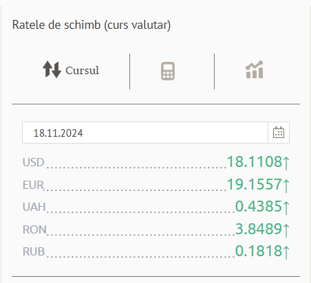 Euro și dolarul cresc. Banca Națională a Moldovei a stabilitpentru astăzi, 18 noiembrie, un curs de 18,11 lei pentru un dolar, iar pentru un euro - 19,15.