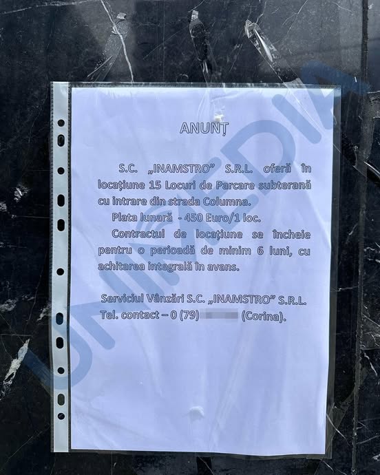 „S. C. „Inamstro” S.R.L. oferă în locațiune 15 locuri de parcare subterană cu intrare din strada Columna. Plata lunară - 450 eruo/per loc.