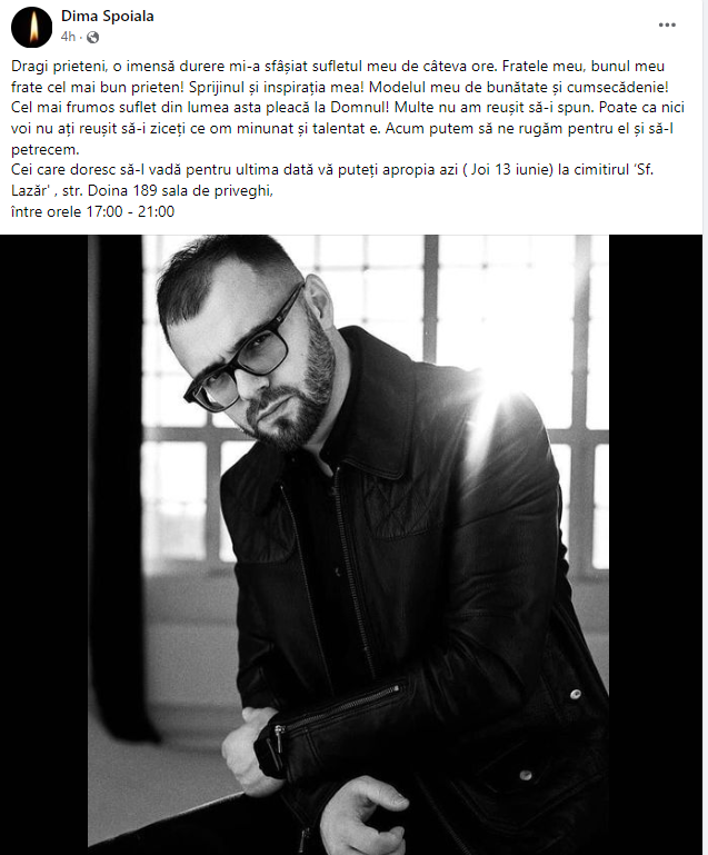Cei care doresc să-l vadă pentru ultima dată vă puteți apropia azi ( Joi 13 iunie) la cimitirul ‘Sf. Lazăr' , str. Doina 189 sala de priveghi, între orele 17:00 - 21:00”, a scris fratele lui Arcadie Spoială, pe rețele.
