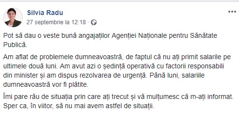 Deși nu a precizat cum va fi rezolvată această situație, dânsa a dat asigurări că până luni salariile vor fi plătite. Cel puțin, asta a scris Silvia Radu, la data de 27 septembrie, pe pagina sa de Facebook.