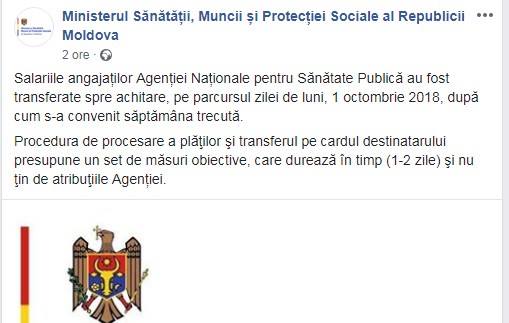 Totuși, pe pagina Ministerului Sănătății, Muncii și Protecției Sociale al Republcii Moldova a parvenit informația precum că salariileau fost transferate spre achitare ieri, dar procedura mai durează.