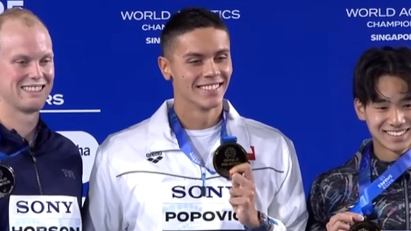 Mândru de performanța sa, complet răvășit de emoții și strigătele de apreciere ale românilor prezenți să-l susțină, Popovici a stat drept, cu aurul la gât, în timp ce imnul României a răsunat, pentru prima oară, în sala din Singapore. Apoi și-a permis să zâmbească. A fost o eliberare pentru sportivul nostru, care a fost la un pas să abandoneze, cu 3 zile înainte de startul concursului.