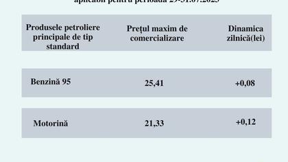 În consecință, pentru următoarele trei zile, 29.07.2023-31.07.2023, prețurile maximale de comercializare cu amănuntul a produselor petroliere principale de tip standard sunt stabilite la nivelul de: