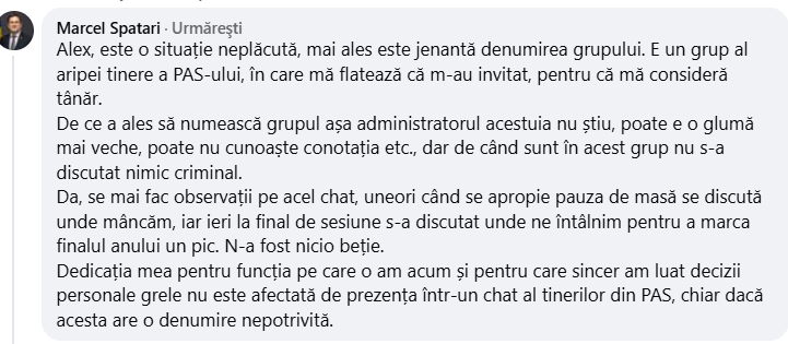 „Este o situație neplăcută, mai ales este jenantă denumirea grupului. E un grup al aripei tinere a PAS-ului, în care mă flatează că m-au invitat, pentru că mă consideră tânăr.