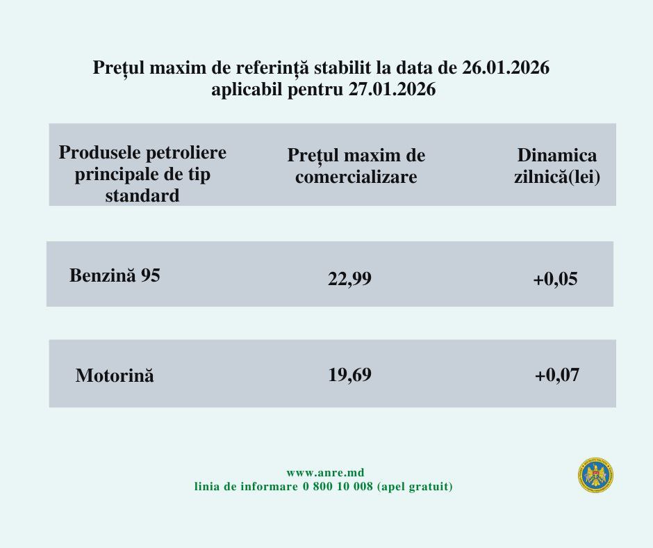 Agenția Națională pentru Reglementare în Energetică (ANRE) a afișat noile prețuri la carburanți pentru mâine, 27 ianuarie. Astfel, benzina va fi mai scumpă cu 5 bani, iar prețul motorinei crește cu 7 bani.
