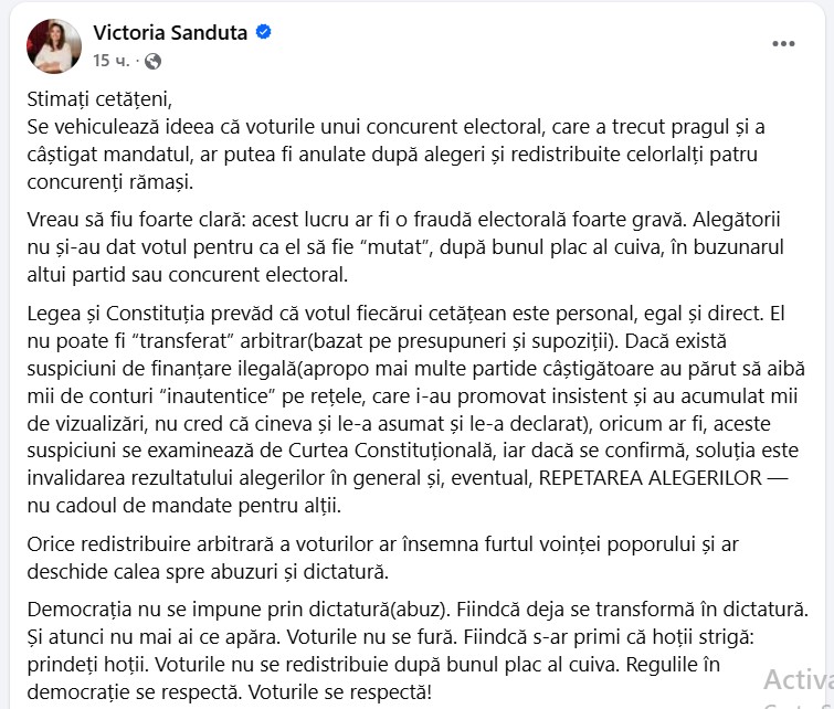 Legea și Constituția prevăd că votul fiecărui cetățean este personal, egal și direct. El nu poate fi „transferat” arbitrar (bazat pe presupuneri și supoziții). Dacă există suspiciuni de finanțare ilegală (apropo mai multe partide câștigătoare au părut să aibă mii de conturi „inautentice” pe rețele, care i-au promovat insistent și au acumulat mii de vizualizări, nu cred că cineva și le-a asumat și le-a declarat), oricum ar fi, aceste suspiciuni se examinează de Curtea Constituțională, iar dacă se confirmă, soluția este invalidarea rezultatului alegerilor în general și, eventual, repetarea alegerilor — nu cadoul de mandate pentru alții.