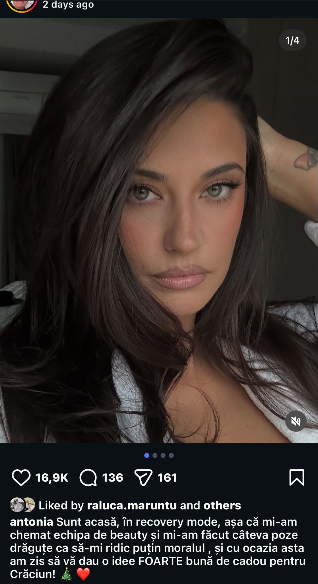„Sunt acasă, în recovery mode, așa că mi-am chemat echipa de beauty și mi-am făcut câteva poze drăguțe ca să-mi ridic puțin moralul, și cu ocazia asta am zis să vă dau o idee FOARTE bună de cadou pentru Crăciun”, a scris Antonia pe Instagram.