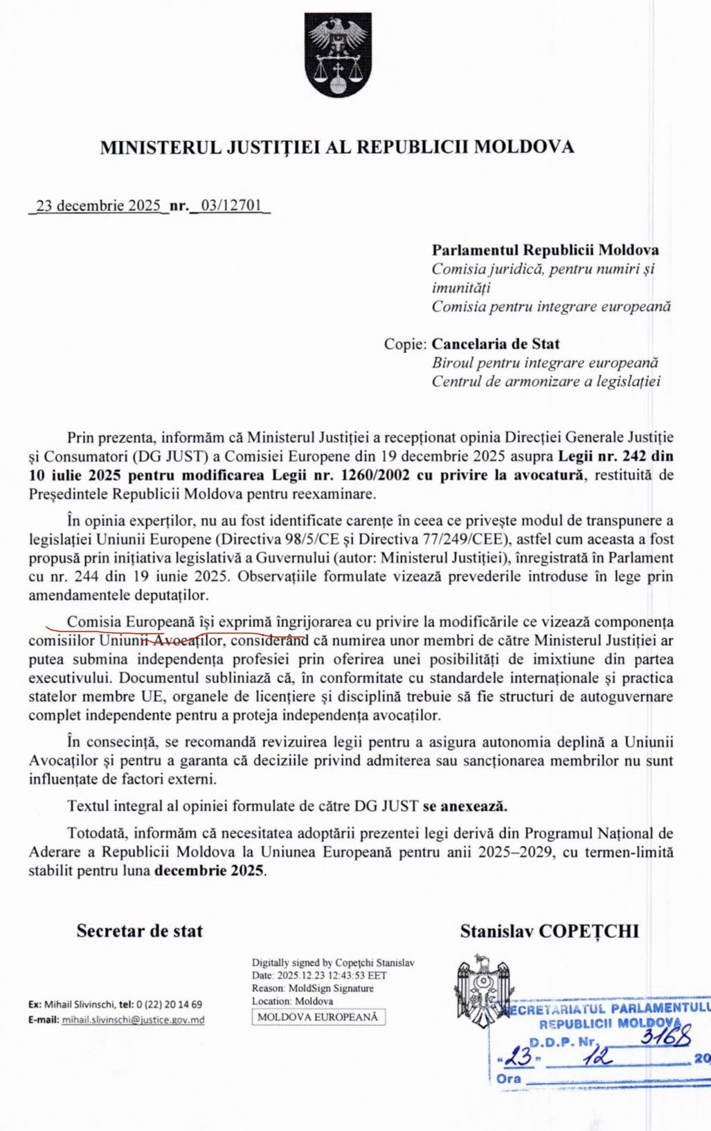 În context, Chicu a citat un extras din opinia Direcției Generale Justiție (DG JUST) a Comisiei Europene, potrivit căruia instituția europeană și-ar fi exprimat îngrijorarea cu privire la modificările ce vizează componența comisiilor Uniunii Avocaților, menționând că numirea unor membri de către Ministerul Justiției ar putea submina independența profesiei, prin posibilitatea unei imixtiuni din partea executivului.