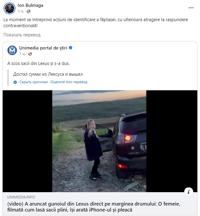 „La moment se întreprind acțiuni de identificare a făptașei, cu ulterioara atragere la răspundere contravențională”, a scris Ion Bulmaga.