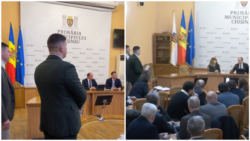 Consilierul municipal PAS Ion Melnic, însoțit de colegul său, Sergiu Crețu, a intrat în sala de ședințe a Primăriei în timp ce Andrei Pavaloi, șef adjunct al Direcției generale educație, tineret și sport, citea un raport de la tribuna centrală.