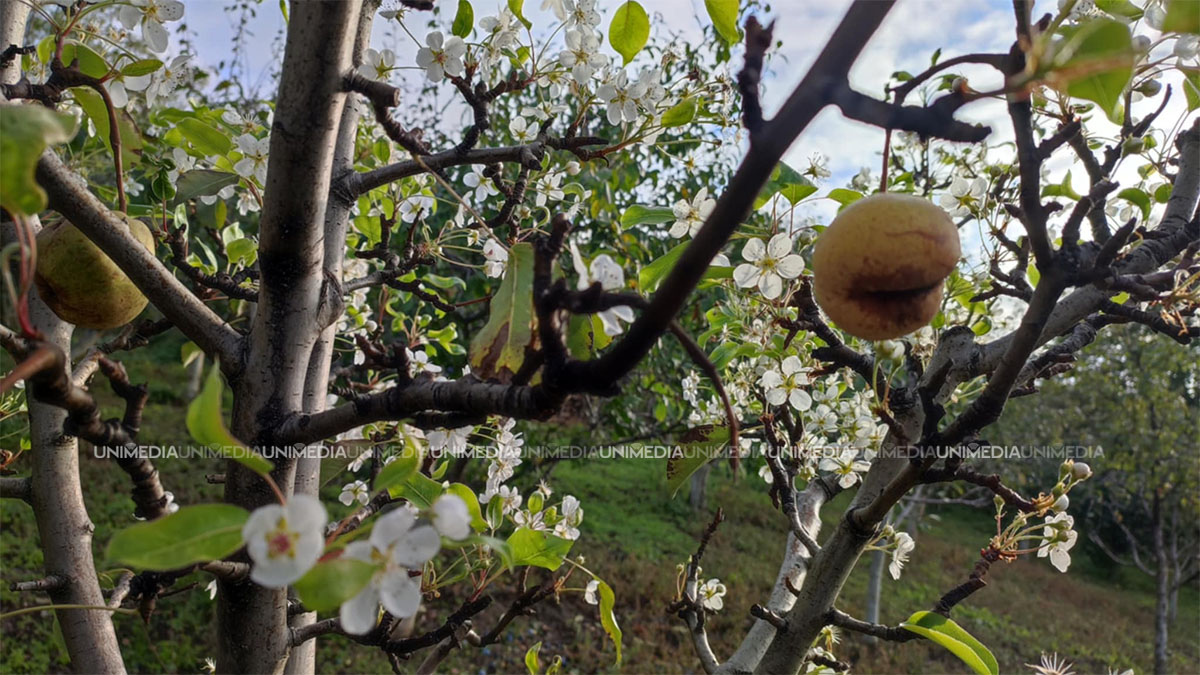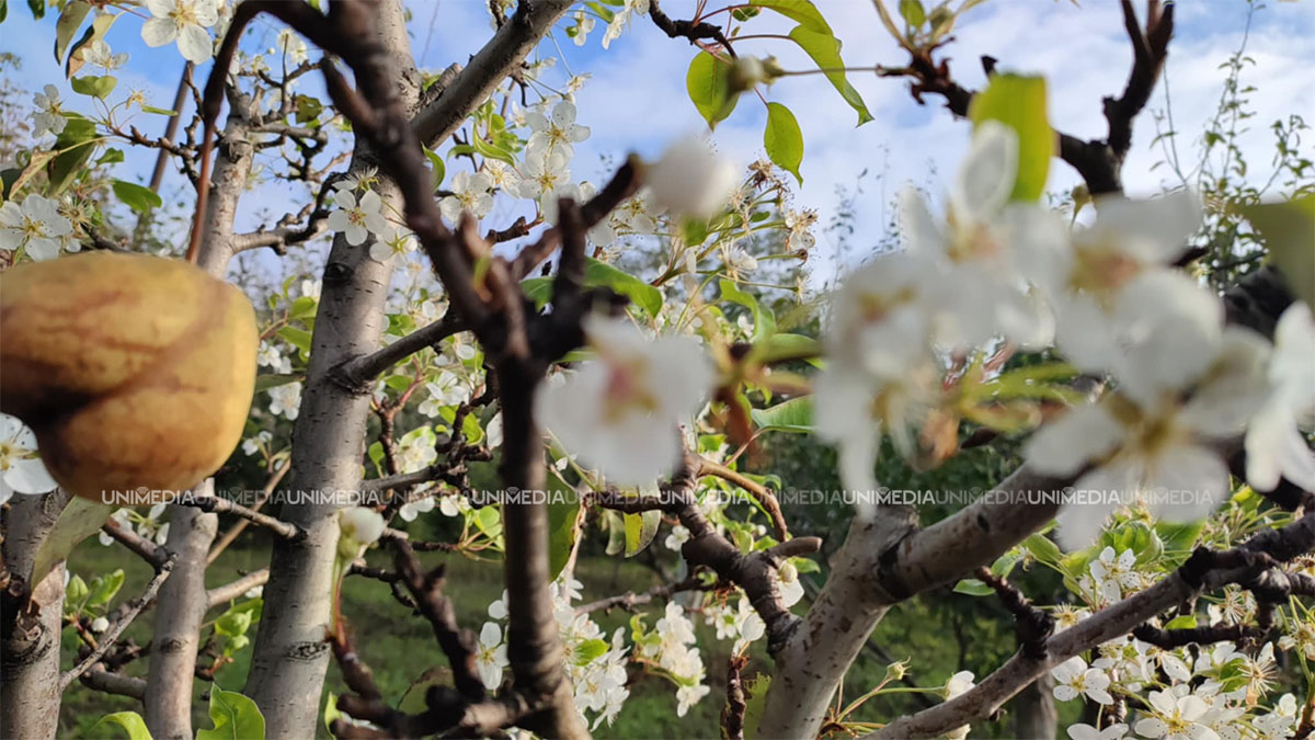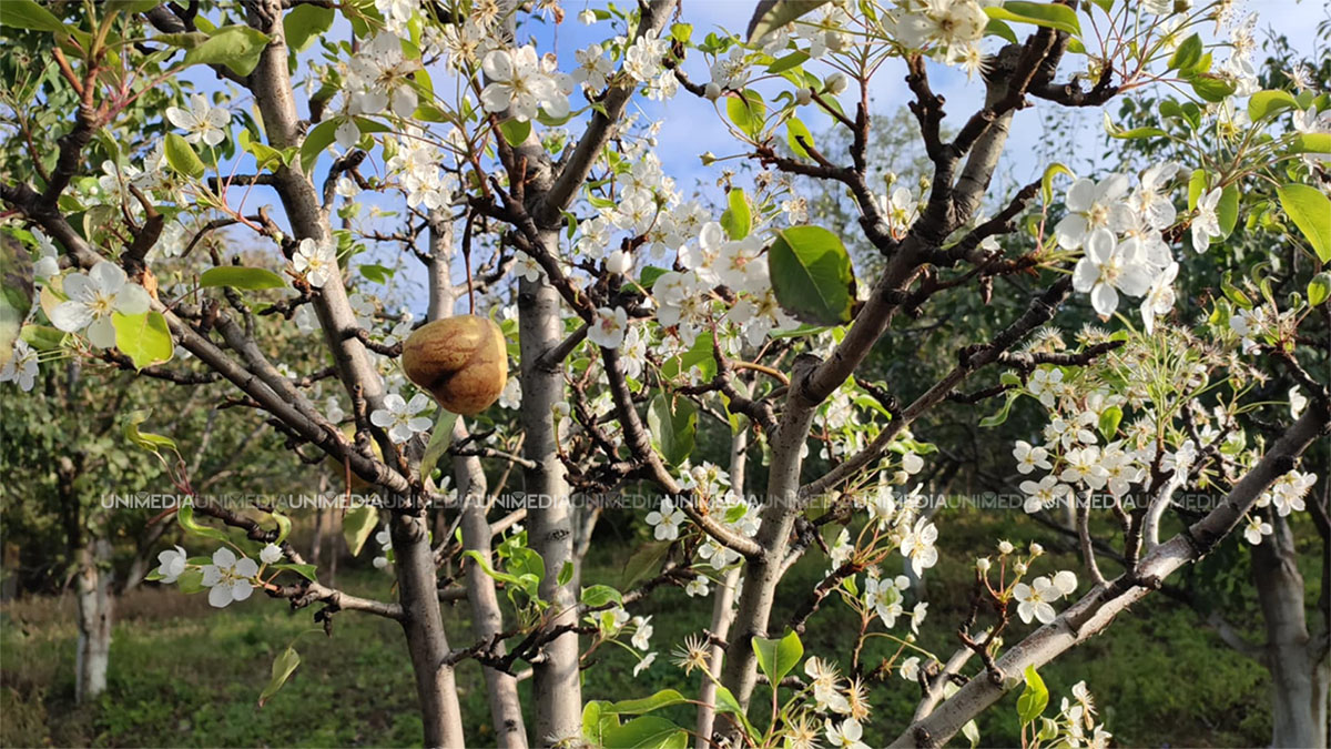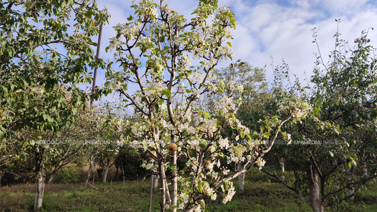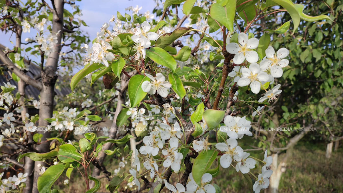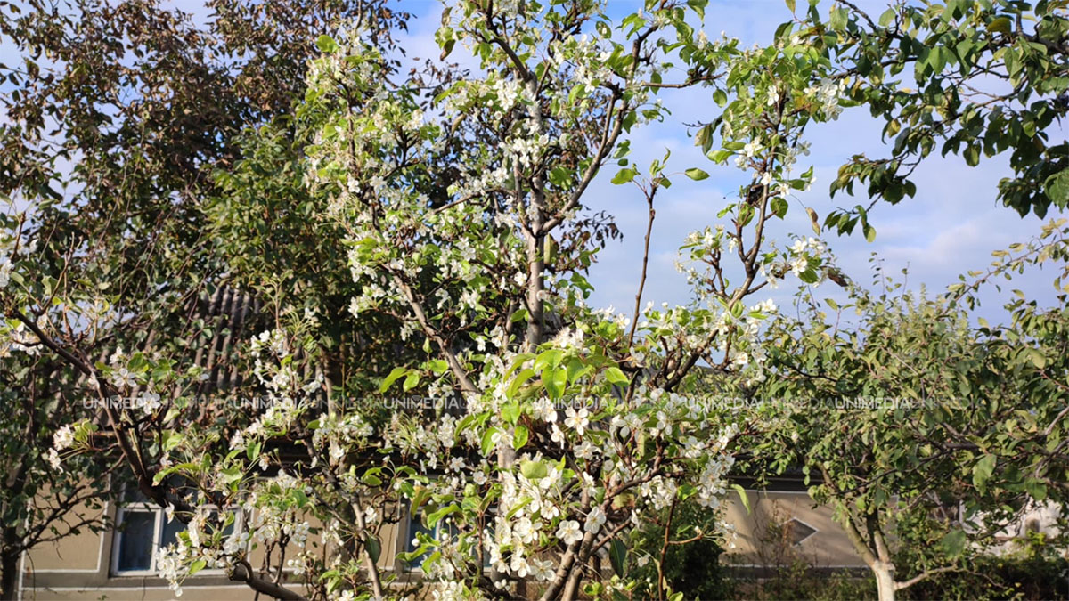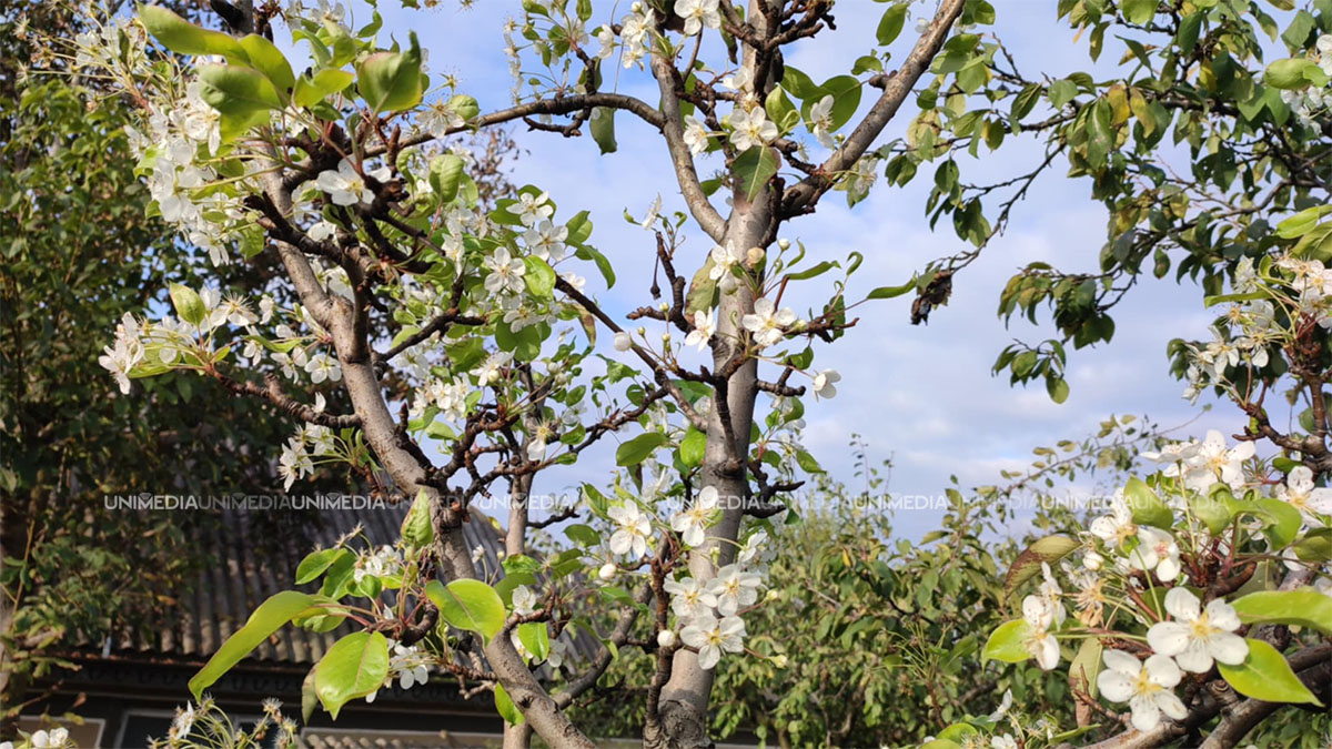 Fenomen neobișnuit în satul Milești, raionul Nisporeni. Un copac de pere a înflorit, având fructele încă pe el.