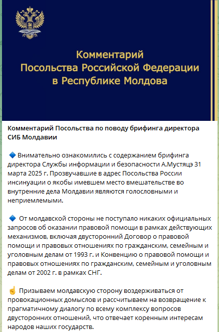 „Am examinat cu atenție conținutul ședinței de informare a directorului Serviciului Informații și Securitate, din 31 martie 2025. Insinuările făcute la adresa Ambasadei Rusiei cu privire la presupusa imixtiune în afacerile interne ale Republicii Moldova sunt nefondate și inacceptabile.