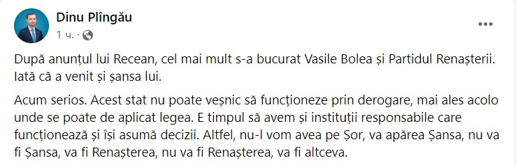 „Acest stat nu poate veșnic să funcționeze prin derogare, mai ales acolo unde se poate de aplicat legea. E timpul să avem și instituții responsabile care funcționează și își asumă decizii. Altfel, nu-l vom avea pe Șor, va apărea Șansa, nu va fi Șansa, va fi Renașterea, nu va fi Renașterea, va fi altceva”, a menționat Plîngău.