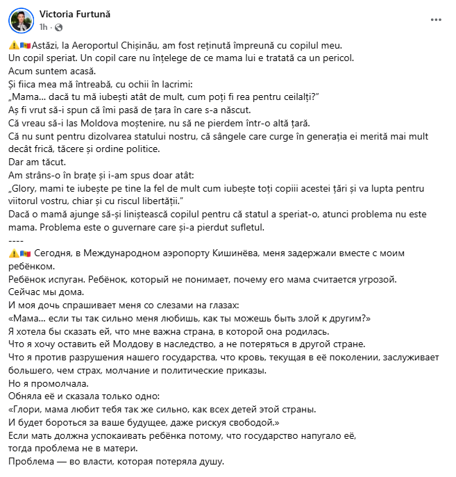 Dacă o mamă ajunge să-și liniștească copilul pentru că statul a speriat-o, atunci problema nu este mama. Problema este o guvernare care și-a pierdut sufletul”, a scris Victoria Furtună, într-o postare pe rețele.