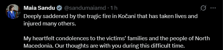 Sincere condoleanțe familiilor victimelor și poporului din Macedonia de Nord. Gândurile noastre sunt cu voi în această perioadă dificilă”, a scris Sandu pe platforma X.