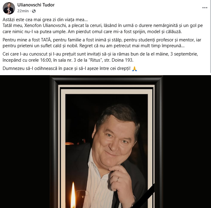 „Astăzi este cea mai grea zi din viața mea. Tatăl meu, Xenofon Ulianovschi, a plecat la ceruri, lăsând în urmă o durere nemărginită și un gol pe care nimic nu-l va putea umple. Am pierdut omul care mi-a fost sprijin, model și călăuză.
