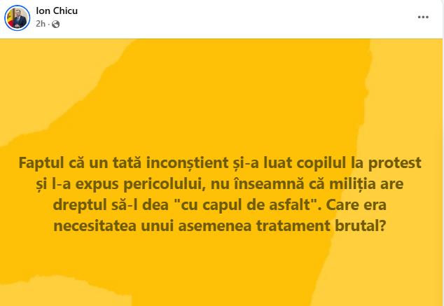 „Faptul că un tată inconștient și-a luat copilul la protest și l-a expus pericolului, nu înseamnă că miliția are dreptul să-l dea „cu capul de asfalt”. Care era necesitatea unui asemenea tratament brutal?”, a scris fostul premier Ion Chicu.