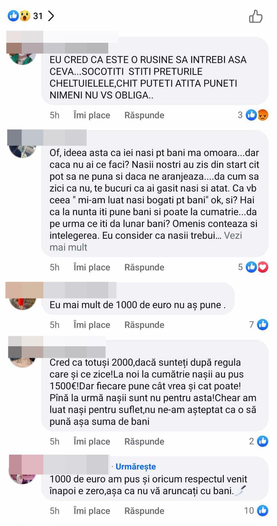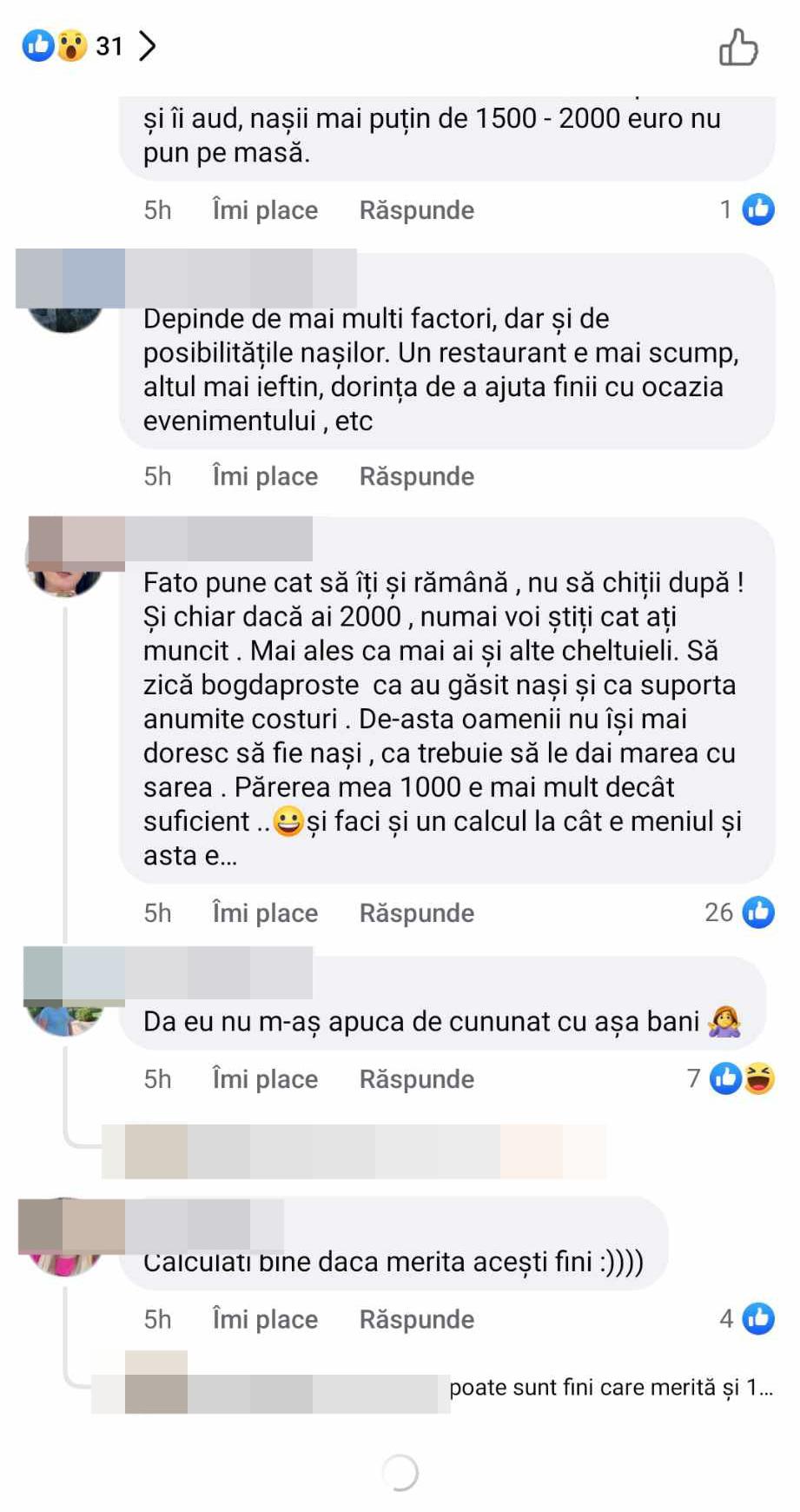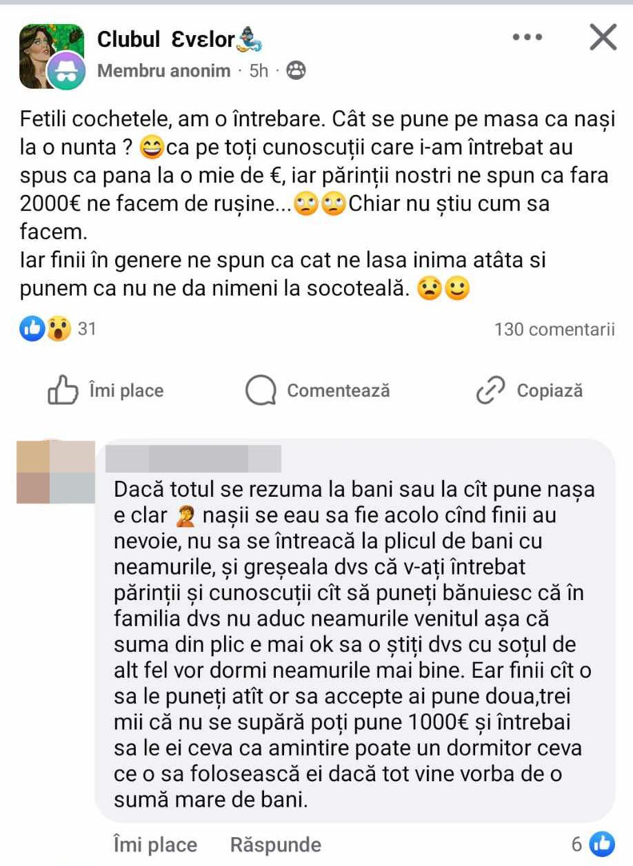 Întrebarea care a provocat dispute sună astfel: „Cât se pune pe masă ca nași, la o nuntă? Toți cunoscuții pe care i-am întrebat ne-au spus că până la 1000 de euro, iar părinții noștri ne spun că fără 2000 de euro ne facem de rușine. Iar finii în genere ne spun cât ne lasă inima atât punem, că nu ne dă nimeni la socoteală”.