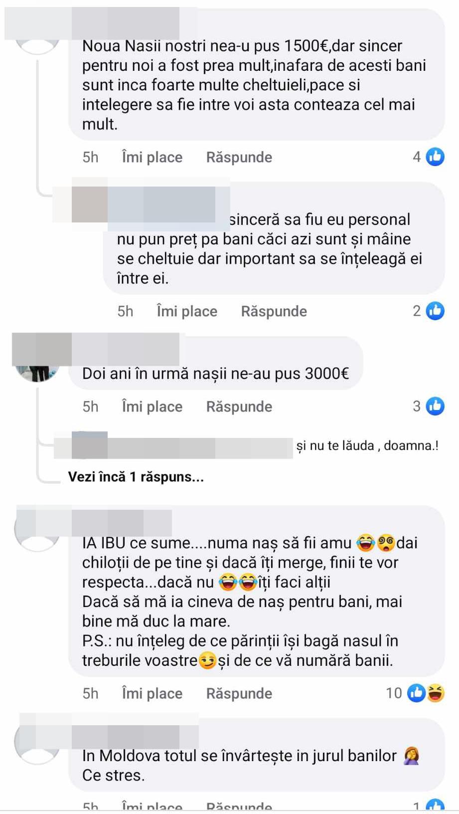 „Nouă nașii ne-au pus 1500 de euro, dar pentru noi a fost prea mult. În afară de acești bani sunt încă foarte multe cheltuieli, pace și înțelegere să fie între voi, asta contează cel mai mult.”