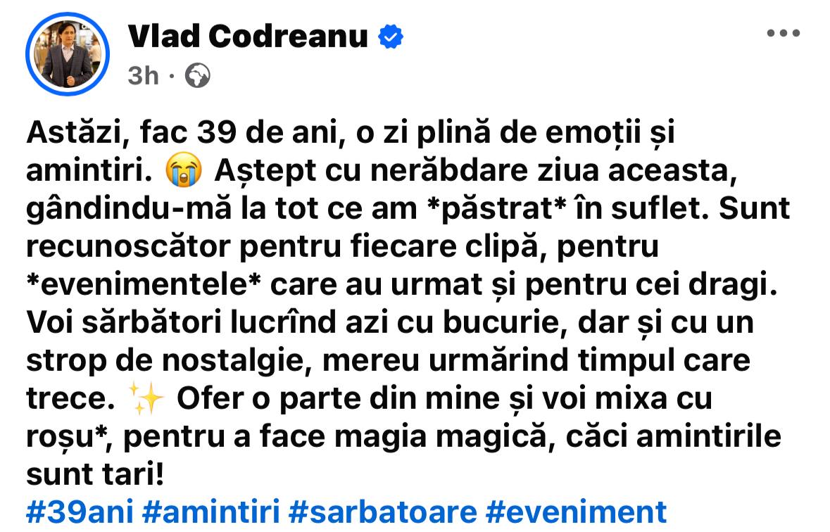 „Astăzi, fac 39 de ani, o zi plină de emoții și amintiri. Aștept cu nerăbdare ziua aceasta, gândindu-mă la tot ce am *păstrat* în suflet. Sunt recunoscător pentru fiecare clipă, pentru *evenimentele* care au urmat și pentru cei dragi. Voi sărbători lucrând azi cu bucurie, dar și cu un strop de nostalgie, mereu urmărind timpul care trece. Ofer o parte din mine și voi mixa cu roșu*, pentru a face magia magică, căci amintirile sunt tari”, a scris interpretul pe rețele.
