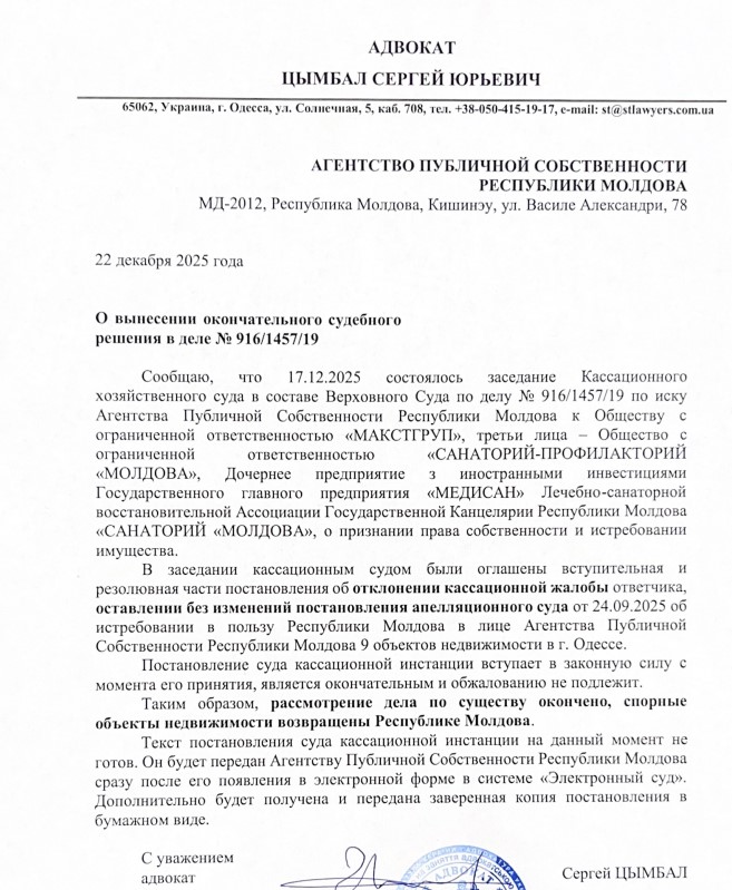 Prin această decizie, procesul judiciar este încheiat definitiv, iar dreptul de proprietate al statului Republica Moldova asupra celor 9 obiecte imobiliare din cadrul Sanatoriului „Moldova” este confirmat fără posibilitatea unor căi ulterioare de atac.