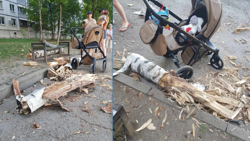 Ajunși polițiștii au stabilit că copacul a căzut peste o bancă pe care stătea o mamă cu un copil în carucior.