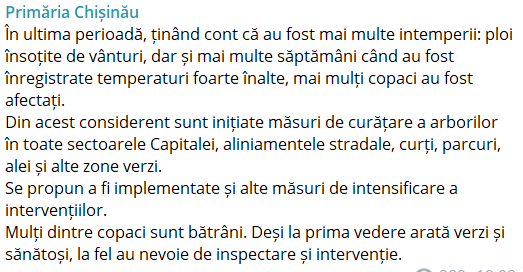 „Din acest considerent sunt inițiate măsuri de curățare a arborilor în toate sectoarele Capitalei, aliniamentele stradale, curți, parcuri, alei și alte zone verzi.