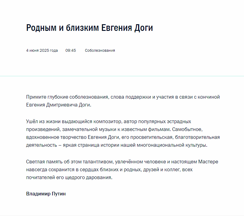 „Vă adresez sincere condoleanțe, cuvinte de sprijin și compasiune în legătură cu trecerea în neființă a lui Eugen Dmitrievici Doga.