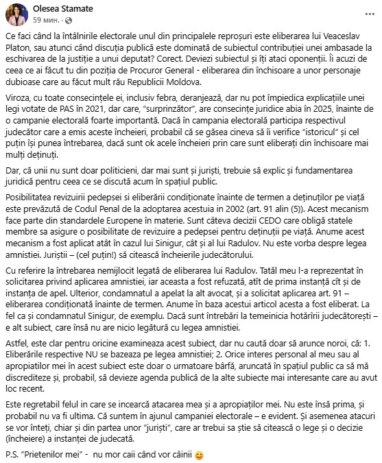 Posibilitatea revizuirii pedepsei si eliberării condiționate înainte de termen a deținuților pe viață este prevăzută de Codul Penal de la adoptarea acestuia în 2002 (art. 91 alin (5)). Acest mecanism face parte din standardele Europene în materie. Sunt câteva decizii CEDO care obligă statele membre sa asigure o posibilitate de revizuire a pedepsei pentru deținuții pe viață. Anume acest mecanism a fost aplicat atât în cazul lui Sinigur, cât și al lui Radulov. Nu este vorba despre legea amnistiei. Juriștii – (cel puțin!) să citească încheierile judecătorului”, a scris Olesea Stamate.