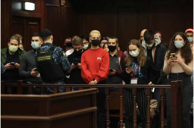 Aleksei Navalnîi, în timpul procesului de judecată, de multe ori zâmbește și își privește soția. Își întinde brațele sau își încrucișează degetele în formă de inimă.