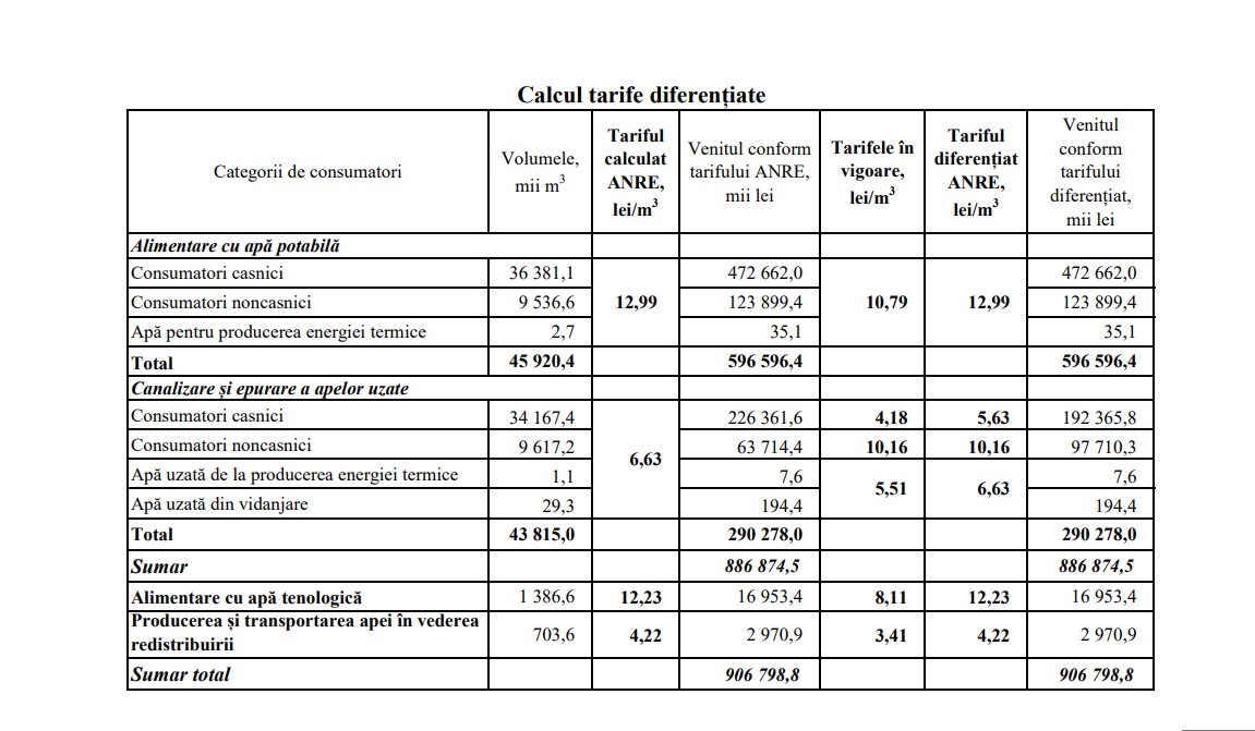 Potrivit proiectului ANRE, noul tarif la apă va fi de 12,99 lei/m3 (fără TVA). În prezent prețul este 10,79 lei/m3. Totodată, consumatorii casnici vor plăti mai mult și pentru serviciile de canalizare. Tariful va crește la 5,63 lei/m3, față de 4,18 lei/m3 în prezent.