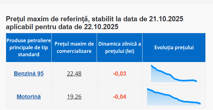 Agenția Națională pentru Reglementare în Energetică a afișat noile prețuri la carburanți pentru mâine, 22 octombrie 2025. Astfel, prețul benzinei va scădea cu 3 bani, iar motorina se va ieftini cu 4 bani.
