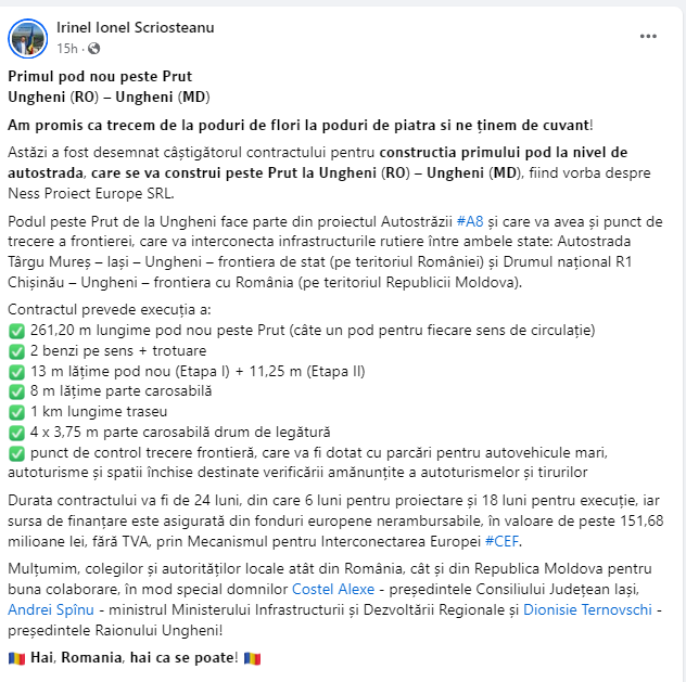Astăzi a fost desemnat câștigătorul contractului pentru construcția primului pot la nivel de autostradă, care se va construi peste Prut la Ungheni (RO) - Ungheni (MD), fiind vorba despre Ness Proiect Europe SRL.