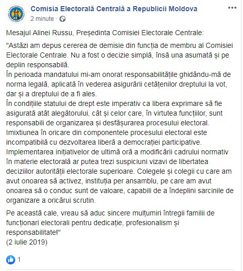 „Astăzi am depus cererea de demisie din funcția de membru al Comisiei Electorale Centrale. Nu a fost o decizie simplă, însă una asumată și pe deplin responsabilă. În perioada mandatului mi-am onorat responsabilitățile ghidându-mă de norma legală, aplicată în vederea asigurării cetățenilor dreptului la vot, dar și a dreptului de a fi ales. În condițiile statului de drept este imperativ ca libera exprimare să fie asigurată atât alegătorului, cât și celor care, în virtutea funcțiilor, sunt responsabili de organizarea și desfășurarea procesului electoral. Imixtiunea în oricare din componentele procesului electoral este incompatibilă cu dezvoltarea liberă a democrației participative. Implementarea inițiativelor de ultimă oră a modificării cadrului normativ în materie electorală ar putea trezi suspiciuni vizavi de libertatea deciziilor autorității electorale superioare. Colegele și colegii cu care am avut onoarea să activez, instituția per ansamblu, pe care am avut onoarea să o conduc sunt de valoare, capabili de a îndeplini sarcinile de organizare a oricărui scrutin”, a menționat Alina Russu.