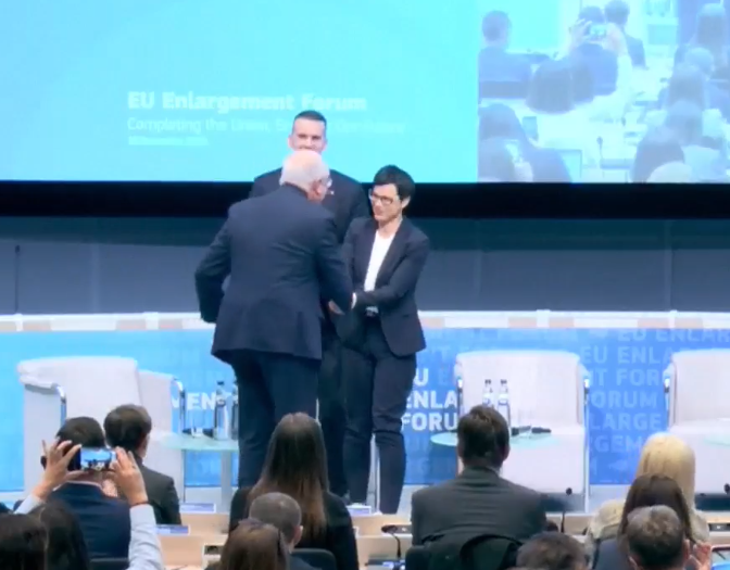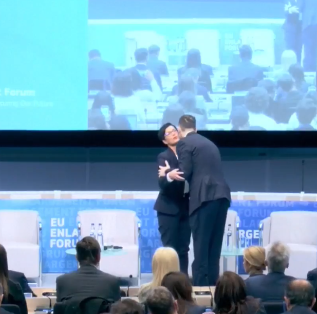 Marta Kos s-a îmbrățișat și s-a sărutat pe obraz cu premierul Muntenegrului Milojko Spajić și cu vicepreședinta Comisiei Europene, Kaja Kallas, dar a fost mai rezervată cu Alexandru Munteanu, limitându-se la o strângere de mână.