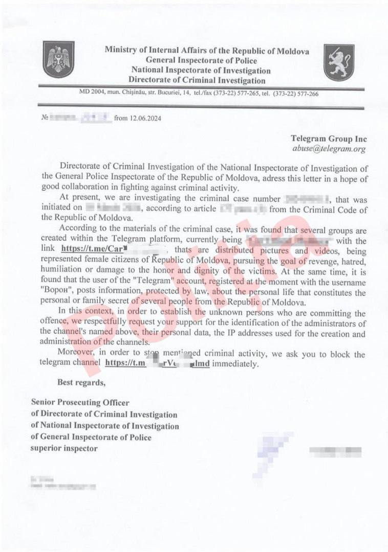 „Poliția Națională a informat că investighează mai multe cazuri legate de un cont de Telegram care publică imagini indecente cu fete și femei din Republica Moldova. Poliția Națională a pornit mai multe cauze penale și sunt realizate un șir de măsuri procesuale și de investigație, inclusiv cu parteneri din afara țării.