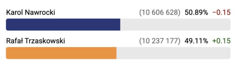 În cifre absolute, Nawrocki a obținut 10.606.628 de voturi, iar Trzaskowski 10.237.177 de voturi, potrivit datelor afișate pe polandelects.com.