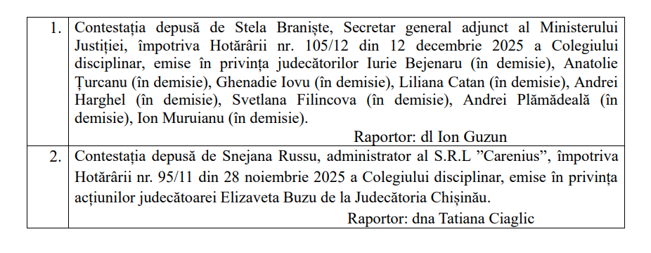 update Membrii CSM au respins contestația depusă de Stela Braniște, Secretar general adjunct al Ministerului Justiției, împotriva Hotărârii nr. 105/12 din 12 decembrie 2025 a Colegiului disciplinar, emise în privința judecătorilor Iurie Bejenaru (în demisie), Anatolie Țurcanu (în demisie), Ghenadie Iovu (în demisie), Liliana Catan (în demisie), Andrei Harghel (în demisie), Svetlana Filincova (în demisie), Andrei Plămădeală (în demisie), Ion Muruianu (în demisie).