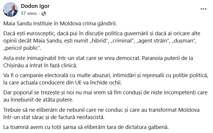 Dacă ești eurosceptic, dacă pui în discuție politica guvernării și dacă ai oricare alte opinii decât Maia Sandu, ești numit „hibrid”, „criminal”, „agent străin”, „dușman”, „pericol public”. Asta este inimaginabil într-un stat care se vrea democrat. Paranoia puterii de la Chișinău a intrat în fază clinică.