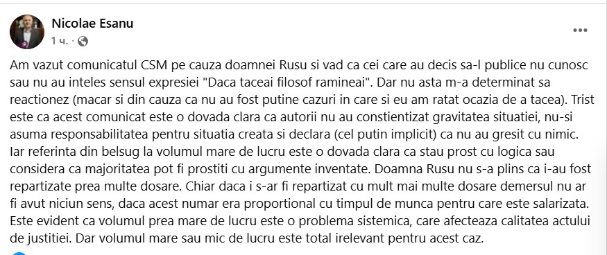 „Am văzut comunicatul CSM privind cauza doamnei Rusu și observ că cei care au decis să-l publice nu cunosc sau nu au înțeles sensul expresiei „Dacă taceai, filosof rămâneai”. Dar nu acest lucru m-a determinat să reacționez (chiar și pentru că nu au fost puține cazuri în care și eu am ratat ocazia de a tăcea).