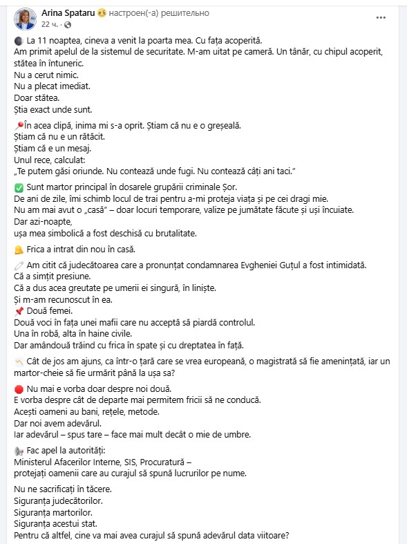 Fac apel la autorități: Ministerul Afacerilor Interne, SIS, Procuratură –protejați oamenii care au curajul să spună lucrurilor pe nume. Nu ne sacrificați în tăcere”, a scris Arina Spătaru într-un mesaj pe rețele.