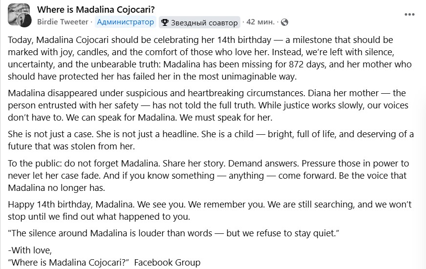 „La mulți ani, Mădălina. Te vedem. Ne amintim de tine. Încă te căutăm și nu ne vom opri până nu aflăm ce s-a întâmplat cu tine. Tăcerea din jurul Mădălinei este mai tare decât cuvintele, dar refuzăm să stăm liniștiți”, se menționează într-o postare din grupul creat pe facebook „Unde este Mădălina Cojocari?” .