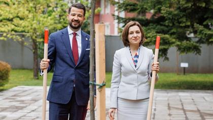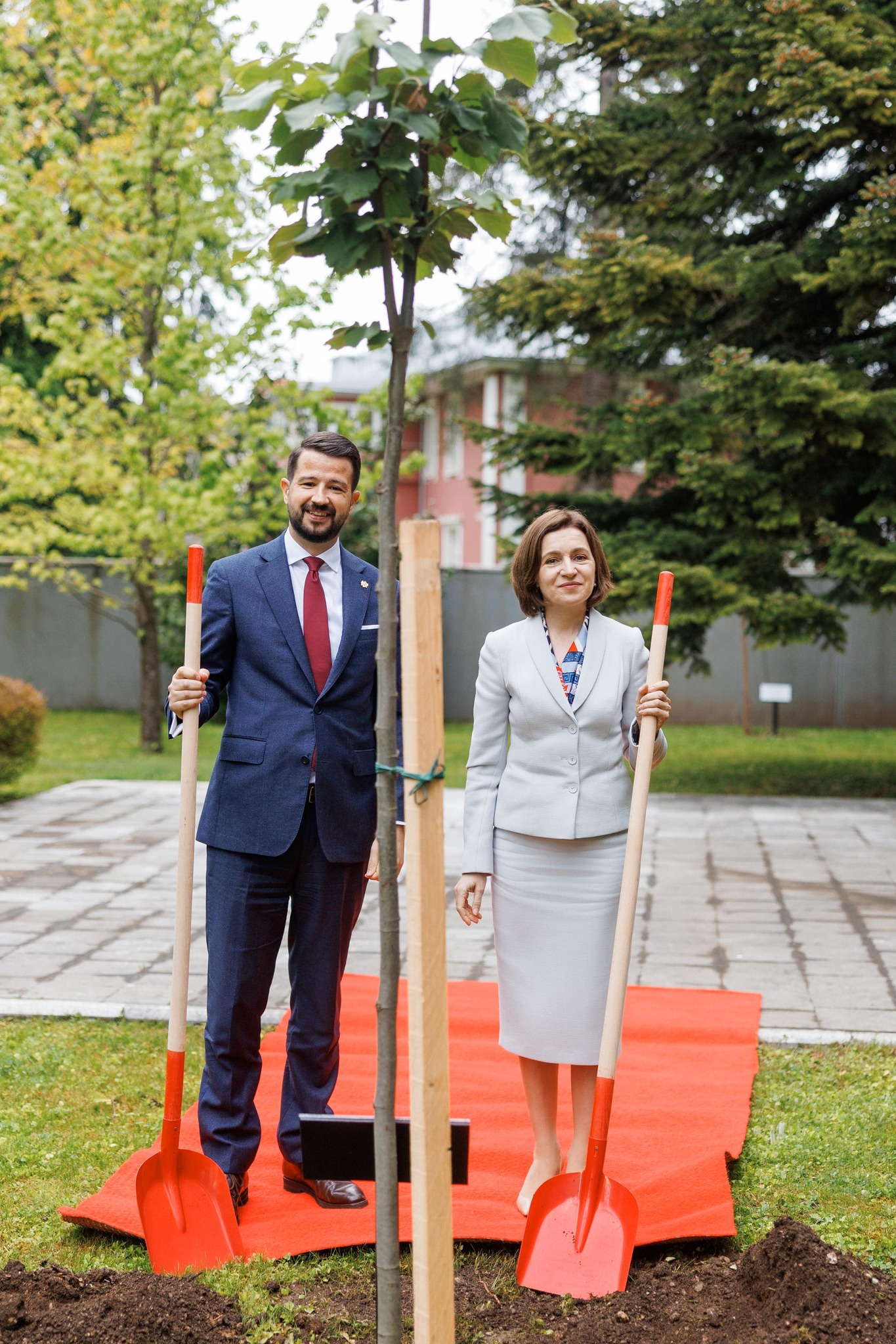 Maia Sandu a făcut publice mai multe imagini din cadrul vizitei la Podgorica, pe pagina sa. În una dintre fotografii, șefa statului apare alături de președintele Muntenegrului, Jakov Milatović, ambii ținând câte o lopată în mâini.
