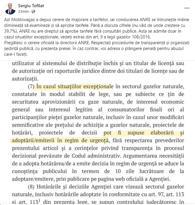 „Astăzi Moldovagaz a depus cerere de majorare a tarifelor, iar conducerea ANRE se întrunește mâine dimineață să examineze și să aprobe tarifele. Până a discuta cifrele (nu văd de unde creștere cu 39,7%), ANRE nu are dreptul să aprobe tarifele fără consultări publice. Asta se admite doar în cazul situațiilor excepționale, vedeți extras din art. 9 a legii gazelor 108/2016.