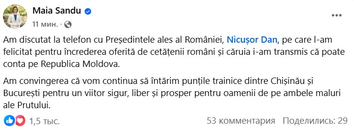 „Am discutat la telefon cu Președintele ales al României, Nicușor Dan, pe care l-am felicitat pentru încrederea oferită de cetățenii români și căruia i-am transmis că poate conta pe Republica Moldova.