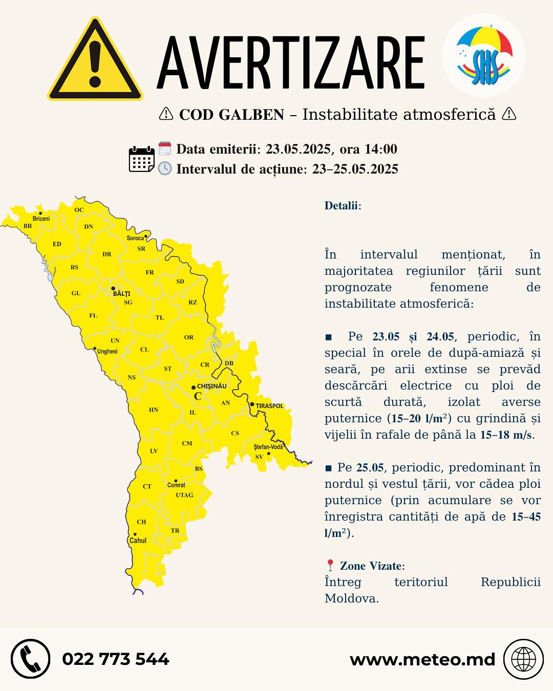 Pe 23 și 24 mai, periodic, în special în orele de după-amiază și seară, pe arii extinse se prevăd descărcări electrice cu ploi de scurtă durată, izolat averse puternice (𝟏𝟓–𝟐𝟎 𝐥/𝐦²) cu grindină și vijelii în rafale de până la 𝟏𝟓–𝟏𝟖 𝐦/𝐬.